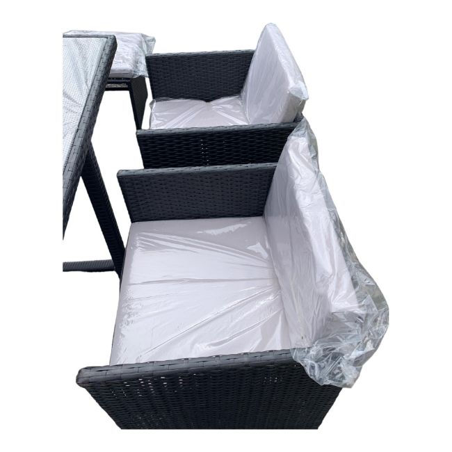 Introducing the 9PC Cube Rattan 8 Seater Garden Set, perfect for enjoying your outdoor space in comfort and style. The set includes 4 comfortable chairs and 4 stools with practical table with a tempered glass top. The chairs are made with a high-quality, weather-resistant rattan material that is both durable and easy to clean, while the cushions are made with a water-resistant fabric that is perfect for outdoor use. The chairs can be neatly tucked away under the table to save space, making this set ideal for smaller gardens or patios.
