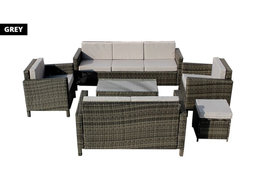 Comprised of a three-seater sofa, a two-seater sofa, two armchairs, a stool, and a toughened glass-topped coffee table.