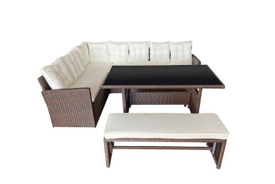 Consists of an L-shaped corner sofa and a bench, offering ample seating for your garden parties.