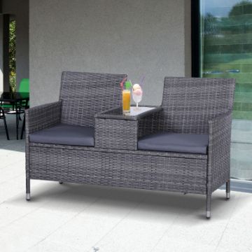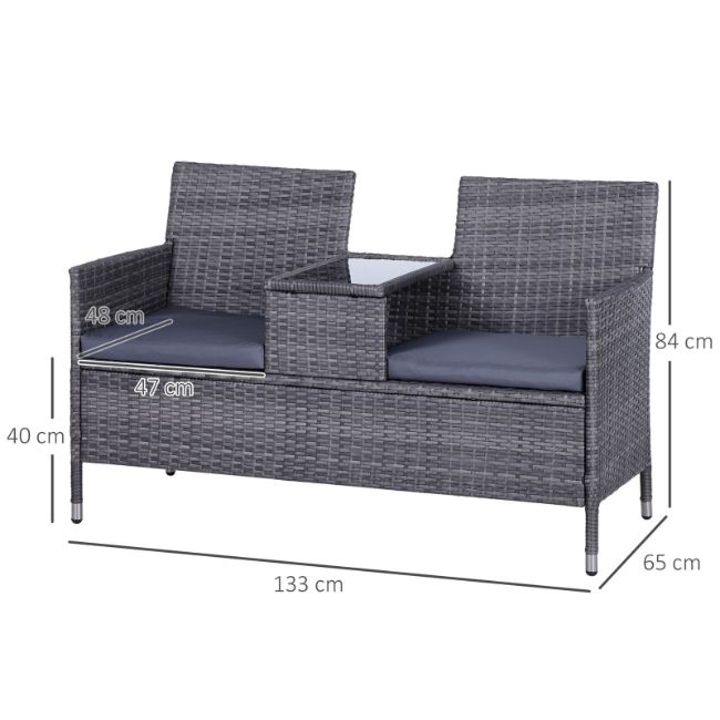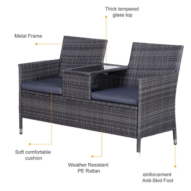 • Make those wonderful times outdoors even better than before with the garden loveseats from Outsunny. Using metal for the base frame to provide underlying strength for seasons to come, it is crafted into a multifunctional two seat and middle table design – giving space for you to sit with a friend with a place to keep drinks, books and smaller items right next to you. Fire-retardant for safety, thick cushions are placed on the seats for comfort, with water-resistant covers.