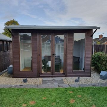with the full length toughened glass windows allowing light to stream in to brighten your day , ideal for a variety of uses from a relaxing garden room to an art/crafts studio, gym or even a stylish home office. This building is an ideal all rounder and can be used throughout the year!