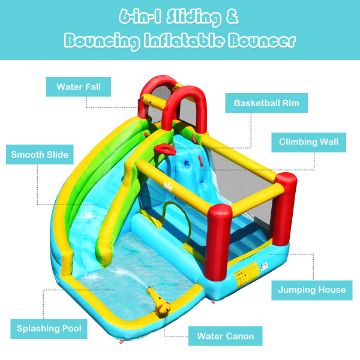 Features water slide, pool, climbing wall, jumping house & basketball rim