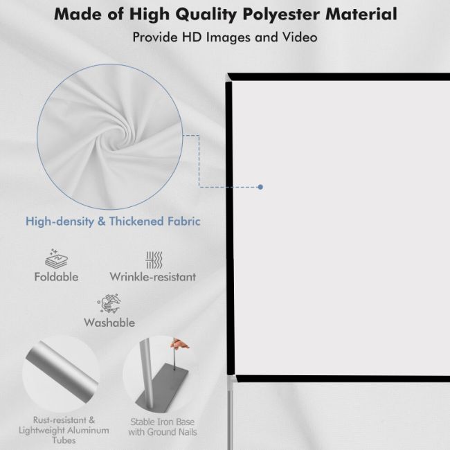 Our foldable screen with stand can meet your different entertainment needs. You can use it for teaching,meeting, watching movie,playing game, watching sport events, etc. 120 inches large screen and 160° wide viewing angle ensure view with enhanced clarity. Besides, wrinkle-resistant and washable polyester material allows you to fold and clean the screen with convenience. Lightweight and portable bag help you to easily carry it from one place to another place. Thus, you can enjoy the movie wherever you like. Additionally, it’s super easy to assemble.