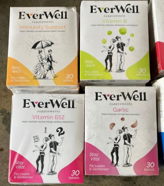 Pallet contains a mix of vitamins shown below 360 packs of each (dates next to each type)