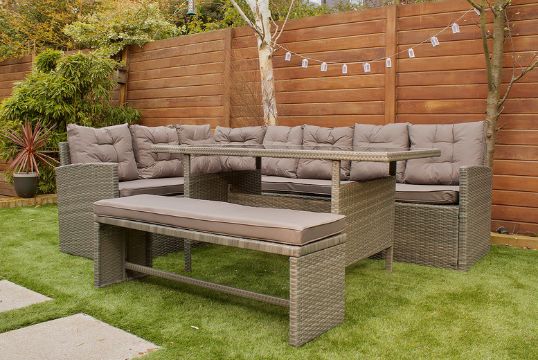 Consists of an L-shaped corner sofa and a bench, offering ample seating for your garden parties.