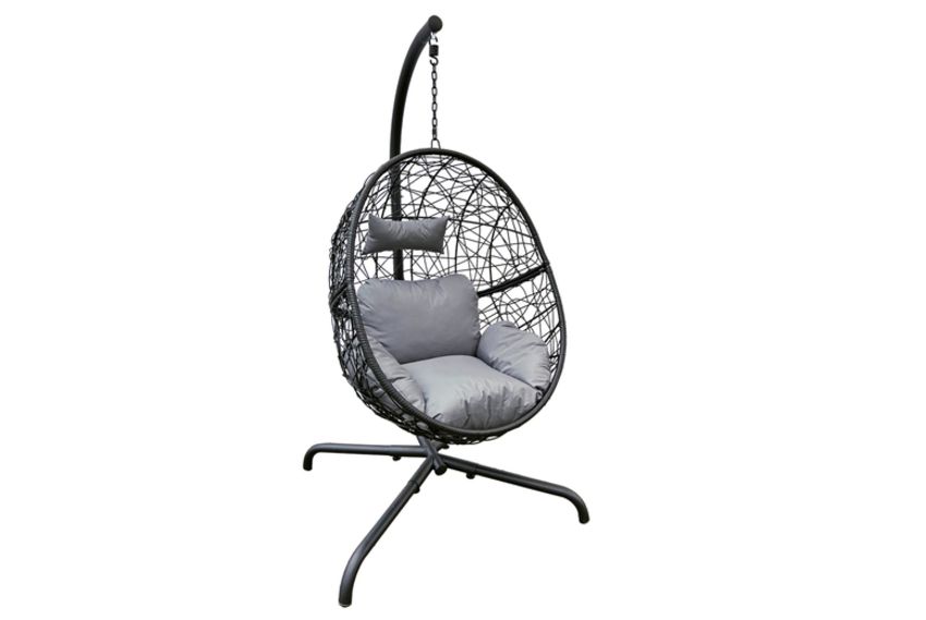 Consists of a sturdy steel frame and hanging egg seat with a cushion and pillow.