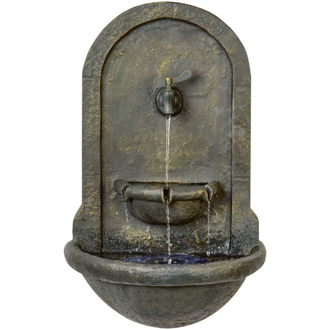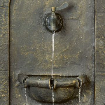 Premier Solar wall-mounted water feature in distressed bronze effect resin with a tap feature is sure to bring intrigue and uniqueness to your outdoor spaces. The water feature is solar powered, hence requires no wiring for installation, just position in full sun. The internal battery stores power for continued use. Install it on a fixed wall and watch as the water flows around. The peaceful and tranquil sound of the water flowing will aid restful afternoons out in the sunshine. The water feature is lit with warm white LEDs for a soft ambient glow.