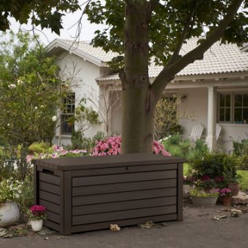 Made from strong moulded resin, this outdoor box is both sturdy and water resistant making it the perfect space for storing your outdoor seat pads, hot tub accessories, or children's toys. With the addition of your own padlock, it is also lockable, ensuring that extra layer of security and peace of mind that all your items are being kept safe and sound. What's more, thanks to the piston hinges incorporated, you'll be able to access what you need with ease and efficiency. This Keter storage box is also finished in a UV stabilised, rich dark brown, with a wood panel effect for a natural and discrete aesthetic.