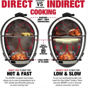 The Char-Griller Akorn features a powder coated exterior finish, porcelain coated steel interior finish, 314 square inch cast iron cooking surface, 133 square inch removable warming rack, an easy dump ash pan, and built in temperature gauge.