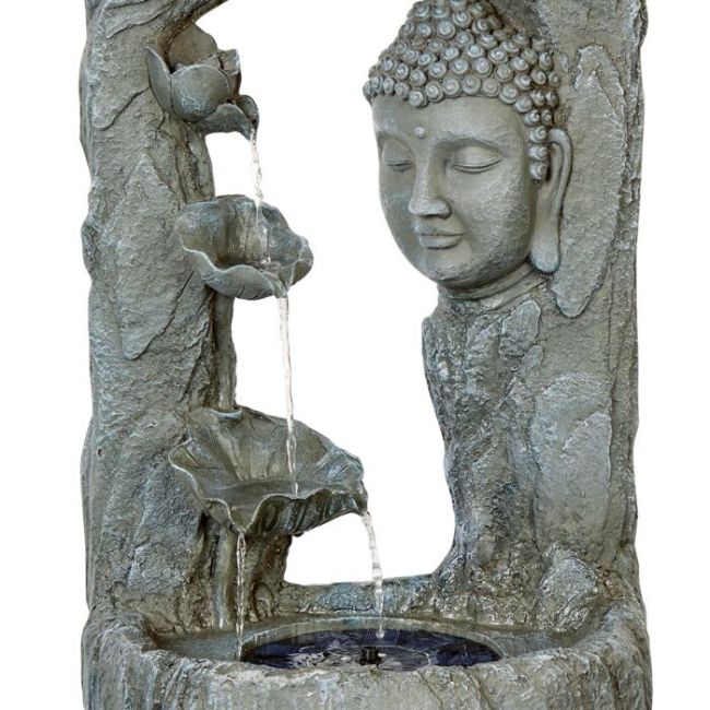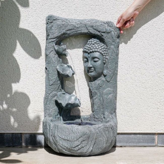 This stunning solar Buddha head water feature is a standout ornamental piece that will bring your garden to life. The stone effect resin fountain features three flower decorations, with the water pouring out from the top flower and trickling down to the two flowers below, and then into the pool. This charming water feature is also a haven for birds, giving welcome relief to garden wildlife. The soothing sound provides a lovely relaxing atmosphere too.