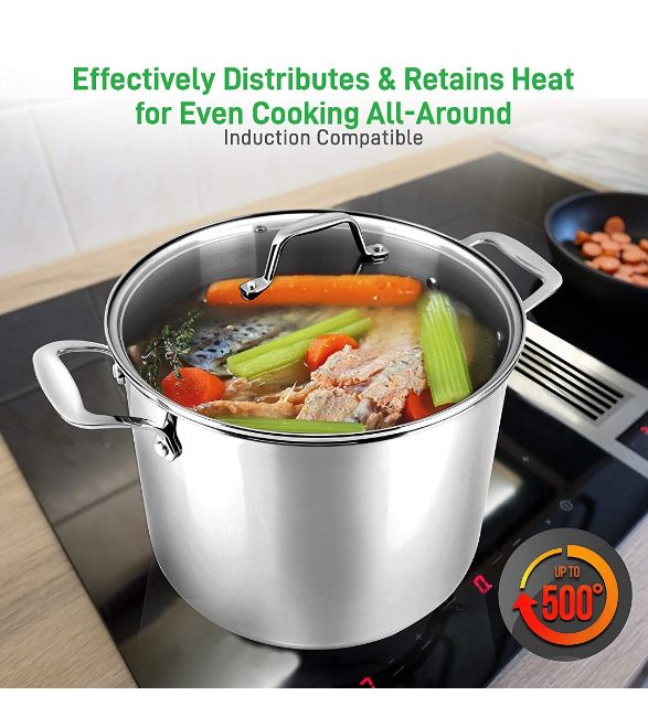 This large pot for cooking is equipped w/ see-through tempered glass lid w/ vent hole that allows steam to escape. It effectively distributes & retains heat for even cooking w/ 500° F max temperature except glass lid.