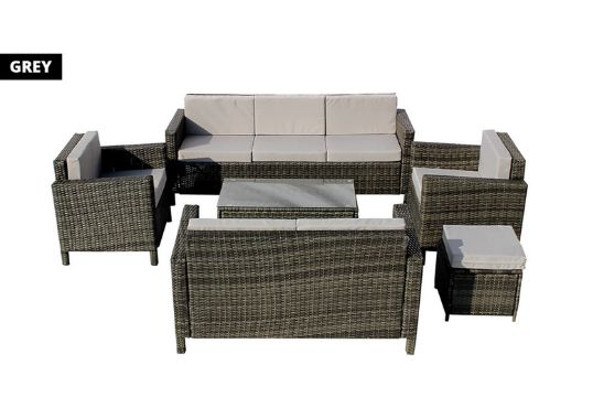 Comprised of a three-seater sofa, a two-seater sofa, two armchairs, a stool, and a toughened glass-topped coffee table.