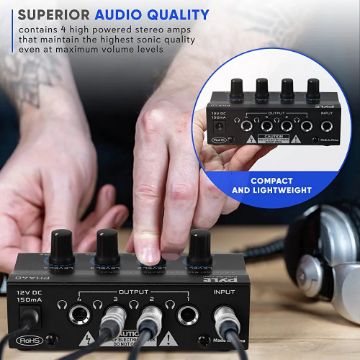 This compact Headphone Amplifier can hold 4 high-power stereo headphones & maintain the clarity of sound even at maximum volume levels. These ultra-low-noise operational amplifiers are included for outstanding audio performance. It allows up to 4 people in a music session to listen to the mix making each capable of adjusting to their volume level preference.