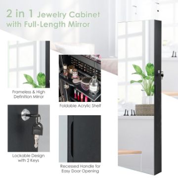 This 2-in-1 mirrored jewelry cabinet with large storage space not only makes it easy for you to dress yourself, but also keeps all your jewelry and cosmetics well organized, such as necklaces, rings, earrings, bracelets, sunglasses, watches, lipsticks and so on. The frameless full-length mirror with clear reflection provides a wide view for you to check your daily outfit. Besides, the built-in mirror with bright 3-color LED light strip surrounded is convenient for you to select jewelry at day or night. And the foldable shelf inside the cabinet is convenient for makeup. This jewelry armoire can be easily hung on the door with 2 hooks or fixed on the wall with screws. Moreover, it comes with a lock and 2 keys to keep children away from your jewelry and prevent unwanted opening.