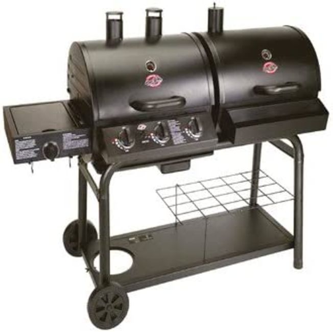 Premier char-griller duo gas and charcoal grill has porcelain coated cast iron cooking surface.