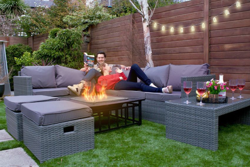 Includes an L-shaped corner sofa, two footstools and a coffee table with a toughened glass top.
