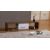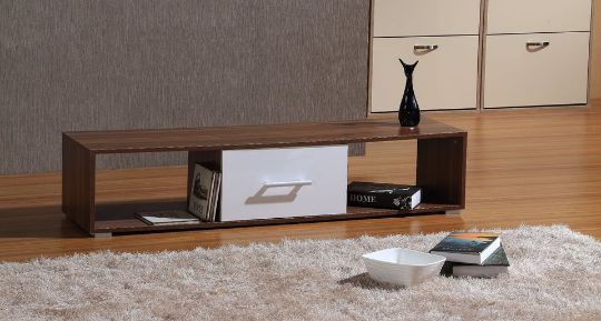 TV STAND HAS a walnut effect frame with a high gloss white drawer front
