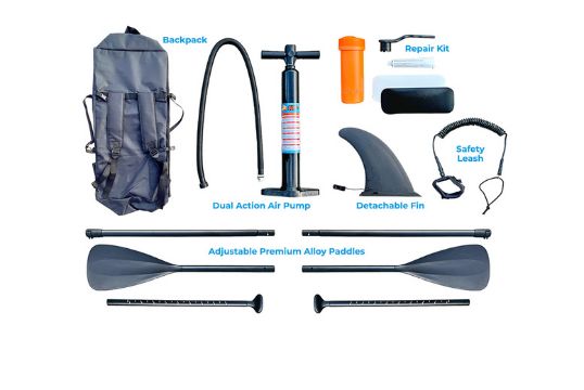 Contents: Comes with two paddles, a high pressure hand pump with pressure gauge, large fin, repair kit, tail vane, backpack and a foot leash.