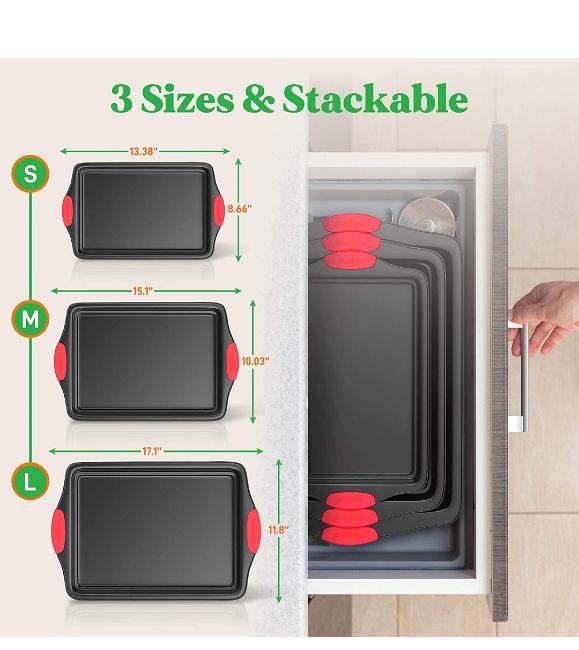 3-PIECE SET: NutriChef 3-piece nonstick cookware set includes the small, medium, and large size of cookie pans. These are a flexible, stylish, and non-stick carbon steel bakeware set with red silicone handles
