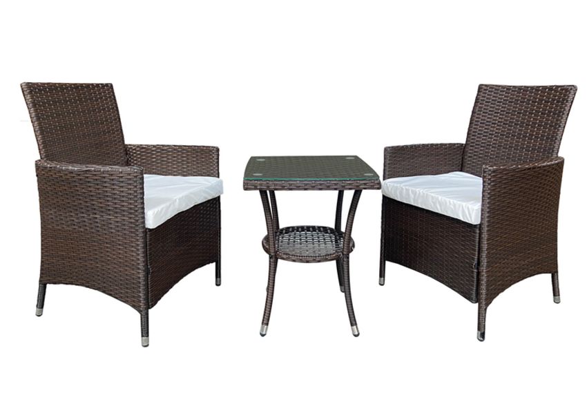 Includes two chairs and a tea table with a 5mm clear tempered toughened glass top.