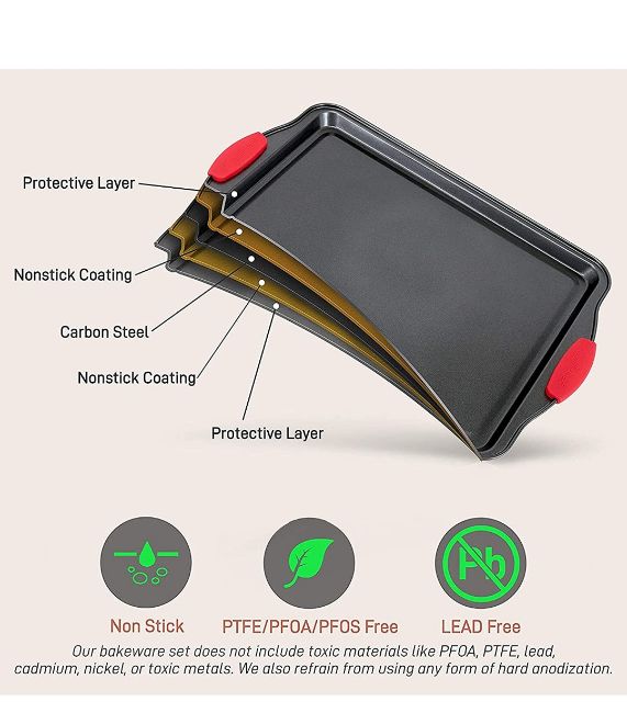 DURABLE BAKEWARE SET: These cookie pans are made from carbon steel & non-stick coating that resists warping to keep your baking, roasting & toasting for years. It is suitable for the oven, refrigerator, and freezer. A reliable cookie sheet oven pan style