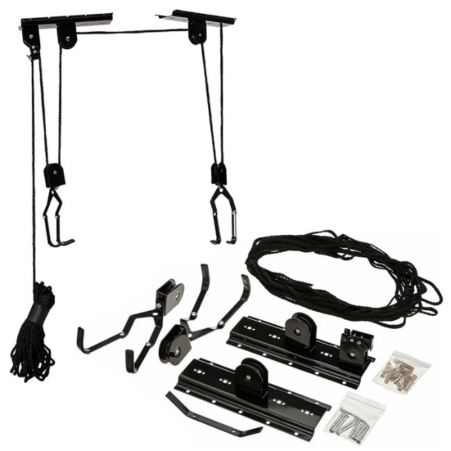 An efficient way to save storage space in your garage is to use this heavy duty bike lift rack, which hoists the bike up from the ground and holds it up until it is next needed. The lift is easy to use, as you just simply attach your bike and pull on the rope which raises and locks the bike in place. Included in this design is a reliable locking mechanism which prevents accidental release.
