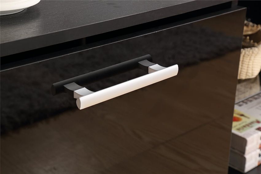 - Contemporary modern high gloss finish doors with silver metal handles and pneumatic hinges.