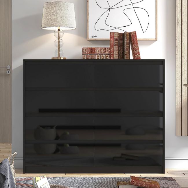 This 8 drawer Handleless chest is an excellent addition to our high gloss bedroom furniture range of Sleek and Stylish furniture. The 8 sturdy individual drawers are in 2 columns of 4. They can take a remarkable amount of weight due to the high strength manufactured wood veneer frame. The drawers fit flush and are manufactured to strict conditions which mean they are stable and firm. With its clean simple design and rich high gloss finish to the drawer fronts, this chest will blend in seamlessly with any modern or traditional bedroom. Manufactured from high grade chipboard with an authentic wood/matt effect finish to the carcass and luxury high gloss fronts (drawers). Available in Black, White and Grey Colours (Select from colour options above) Features High gloss finish to drawer fronts Metal drawer runners Handleless. Easy self-assembly