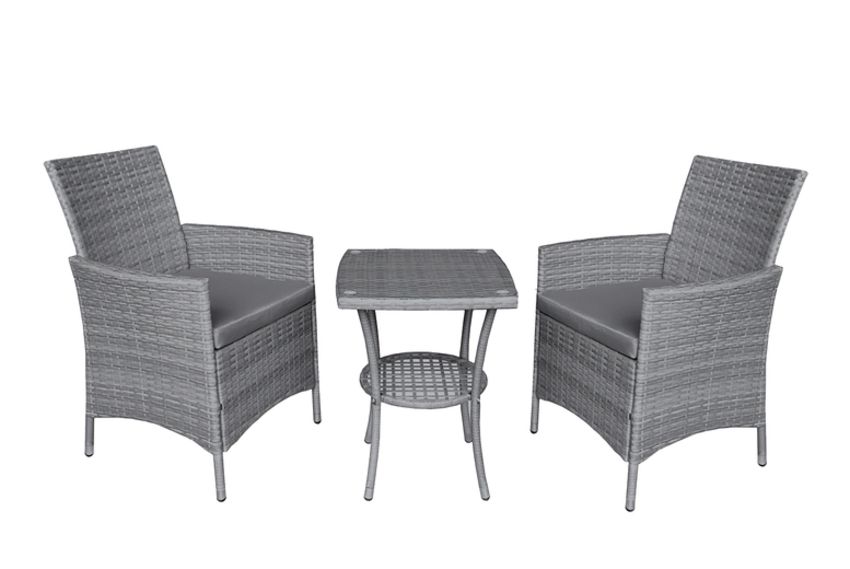 Includes two chairs and a tea table with a 5mm clear tempered toughened glass top.
