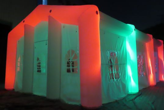 Giant size 10m long x 6m wide LED Marquee, which can be used as a wedding marquee or party tent. Manufactured from white Oxford Cloth.