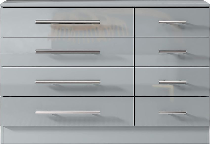 The 8 drawer chest is an excellent addition to our high gloss bedroom furniture range of stylish yet affordable furniture. The 8 drawer chest provides you with the storage space that a wardrobe cannot. The 8 sturdy individual drawers are in 2 columns of 4, one large the other small. They can take a remarkable amount of weight due to the high strength manufactured wood veneer frame. The drawers fit flush and are manufactured to strict conditions which mean they are stable and firm. With its clean simple design and rich high gloss finish, this set will blend in seamlessly with any modern or traditional bedroom. Manufactured from high grade chipboard with an authentic wood/matt effect finish to the carcass and luxury high gloss fronts (doors).