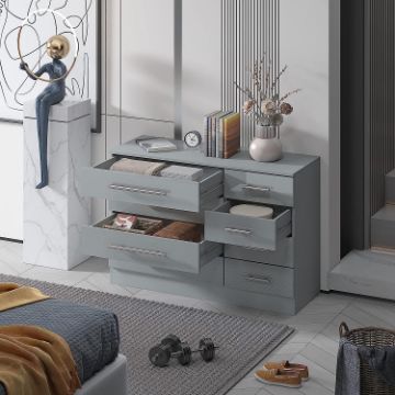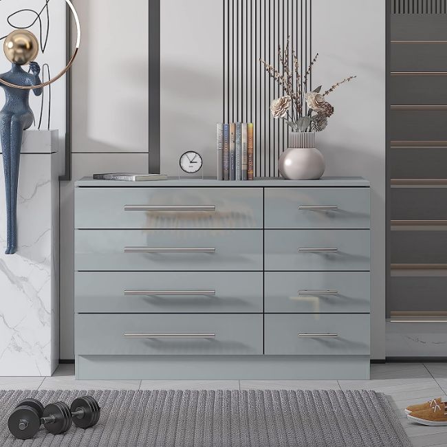 The 8 drawer chest is an excellent addition to our high gloss bedroom furniture range of stylish yet affordable furniture. The 8 drawer chest provides you with the storage space that a wardrobe cannot. The 8 sturdy individual drawers are in 2 columns of 4, one large the other small. They can take a remarkable amount of weight due to the high strength manufactured wood veneer frame. The drawers fit flush and are manufactured to strict conditions which mean they are stable and firm. With its clean simple design and rich high gloss finish, this set will blend in seamlessly with any modern or traditional bedroom. Manufactured from high grade chipboard with an authentic wood/matt effect finish to the carcass and luxury high gloss fronts (doors).