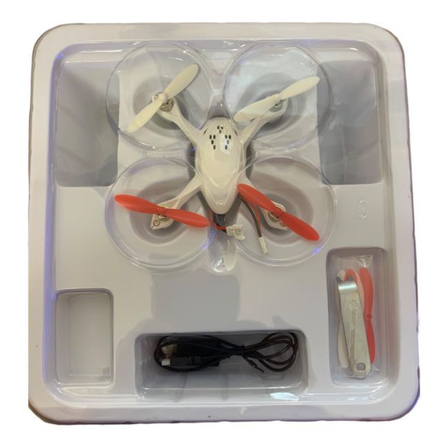 The package includes: 1 radio control, 1 quadcopter, 1 battery, 1 set of spare propellers, 1 propeller protection, 1 propeller disassembly key, 1 USB charging cable, manual in Italian