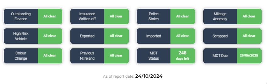 As of report date {24/10/2024} HPI report is all clear - See image!
