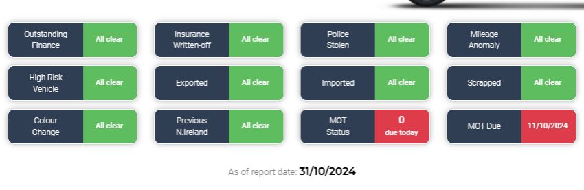 As of report date {31/10/2024} HPI report is all clear - See image!