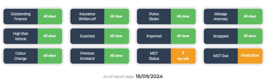 As of report date {18/09/2024} HPI report is all clear - See image!