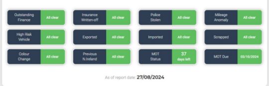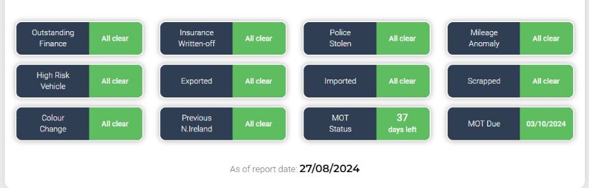 As of report date {28/08/2024} HPI report is all clear - See image!