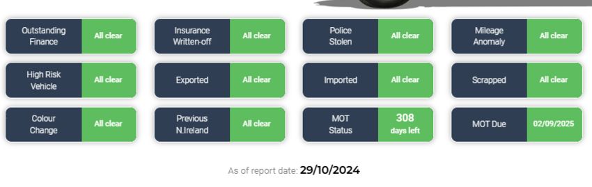 As of report date {29/10/2024} HPI report is all clear - See image!