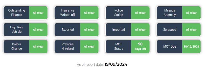 As of report date {19/09/2024} HPI report is all clear - See image!