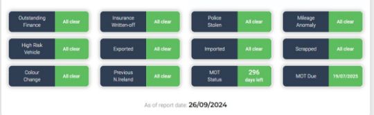 As of report date {26/09/2024} HPI report is all clear - See image!