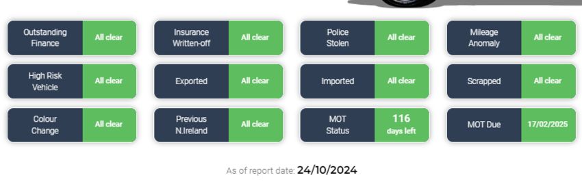 As of report date {24/10/2024} HPI report is all clear - See image!