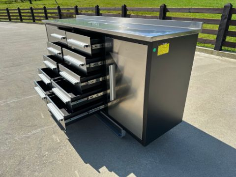 Brand New Unused Stainless Steel 7ft Work Bench with 10 Drawers, 2 Cabinets