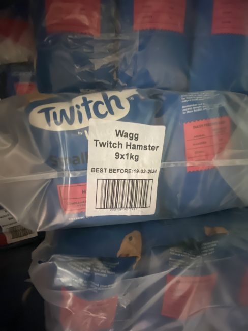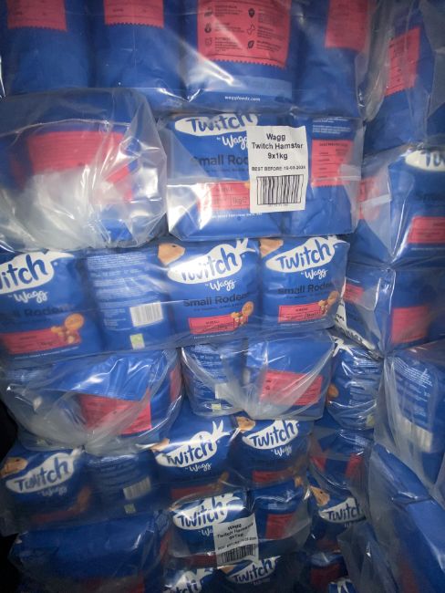 Listing for approx 648 x 1kg bags of wagg twitch hamster rodent food,