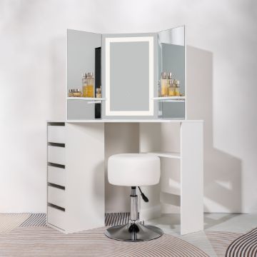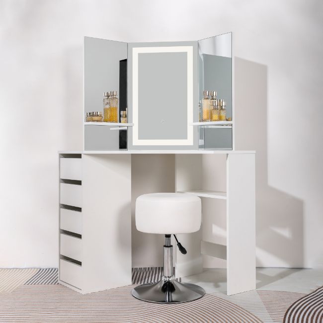 This Corner Dressing Table has 5 Drawers, 3 shelves, 3 mirrors(one with a gorgeous touch button led light). and also comes with a nice adjustable stool.