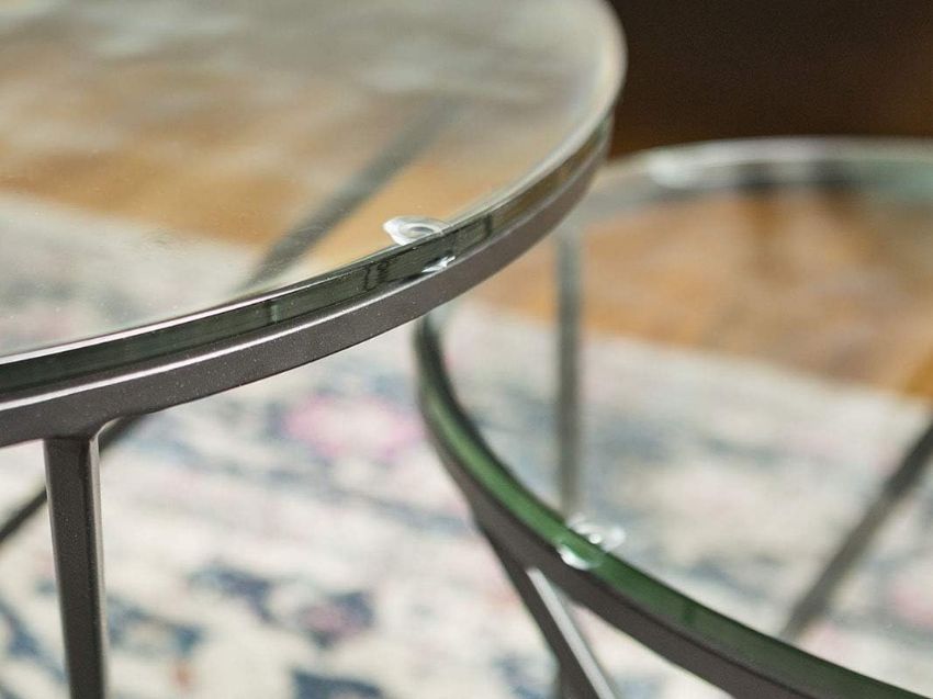 Add a modern Boho element to your living room with our unique geometric nesting table set. Includes one large and smaller coffee table to give you extra table space so you can display your magazines and reading material on one, while the other can be used to decorate with glass vases within your living room. The artfully designed, geometric-shaped base is made up of a painted, sturdy metal frame. Our bold accent table set will be a wonderful addition to your home.