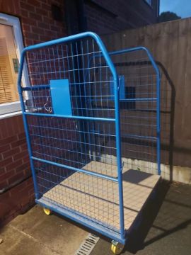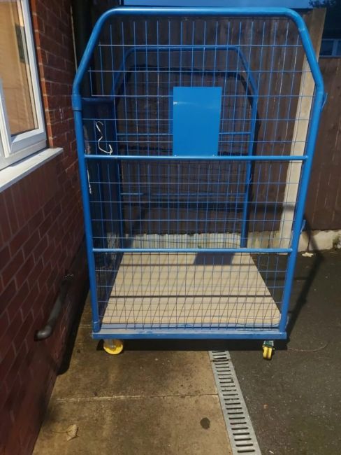LARGE HEAVY DUTY COMMERCIAL TROLLY BLUE METAL FRAME USED W 116.84 CM High 127CM