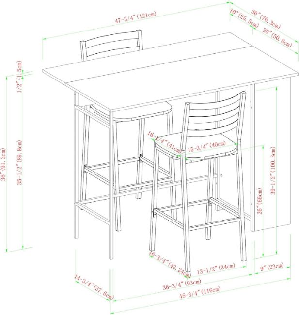 Whether you live in the attic or snuggle up in a home with a cozy layout, this storage set is ideal for small living situations. If you want to upgrade your storage space or counter or create a place to eat peacefully, this product is for you. One side has three storage compartments with an adjustable shelf. It has an extendable leaf connected with sturdy metal hinges. The table and chairs have a melamine coating that creates a moisture-resistant layer. This set contains the table and two counter stools and is delivered in one box.