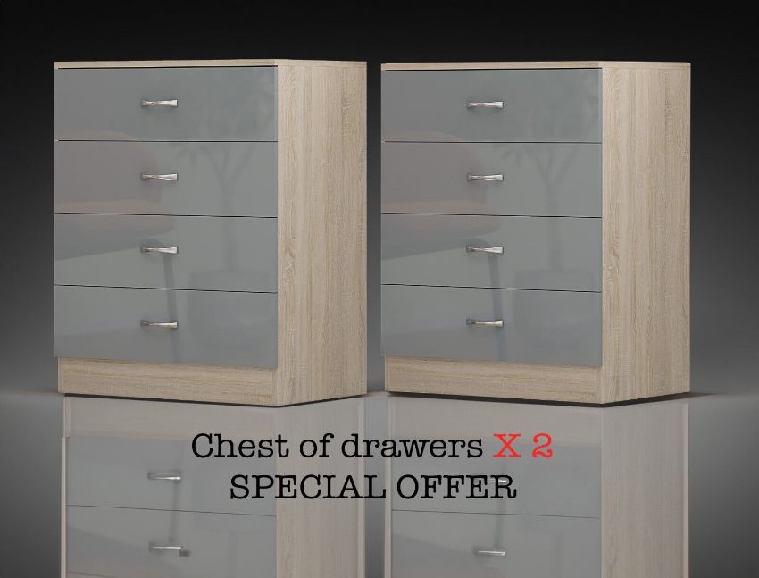 2 X Chest of 4 drawers - The 4 drawer chest is an excellent addition to our high gloss bedroom furniture range of stylish yet affordable furniture. The 4 drawer chest provides you with the storage space that a wardrobe cannot. The sturdy individual drawers are in one column of 4. They can take a remarkable amount of weight due to the high strength manufactured wood veneer frame. The drawers fit flush and are manufactured to strict conditions which mean they are stable and firm.