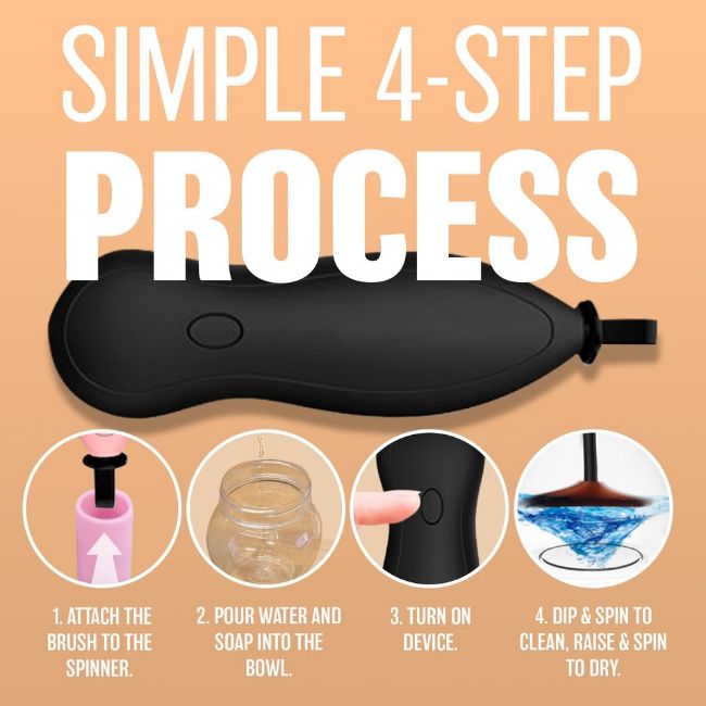 EASY TO USE - Simple steps easily to use this electric makeup cleaner and dryer. 1.Attach the brush to the spinner. 2.Pour water and soap into the bowl. 3.Dip & spin to clean, raise & spin to dry. (instructions included)