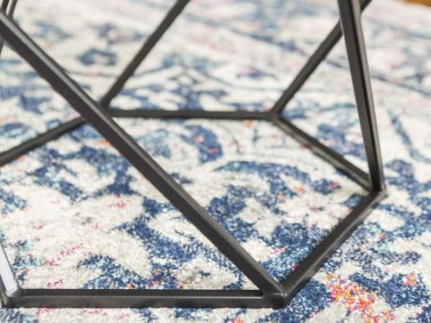 Add a modern Boho element to your living room with our unique geometric nesting table set. Includes one large and smaller coffee table to give you extra table space so you can display your magazines and reading material on one, while the other can be used to decorate with glass vases within your living room. The artfully designed, geometric-shaped base is made up of a painted, sturdy metal frame. Our bold accent table set will be a wonderful addition to your home.
